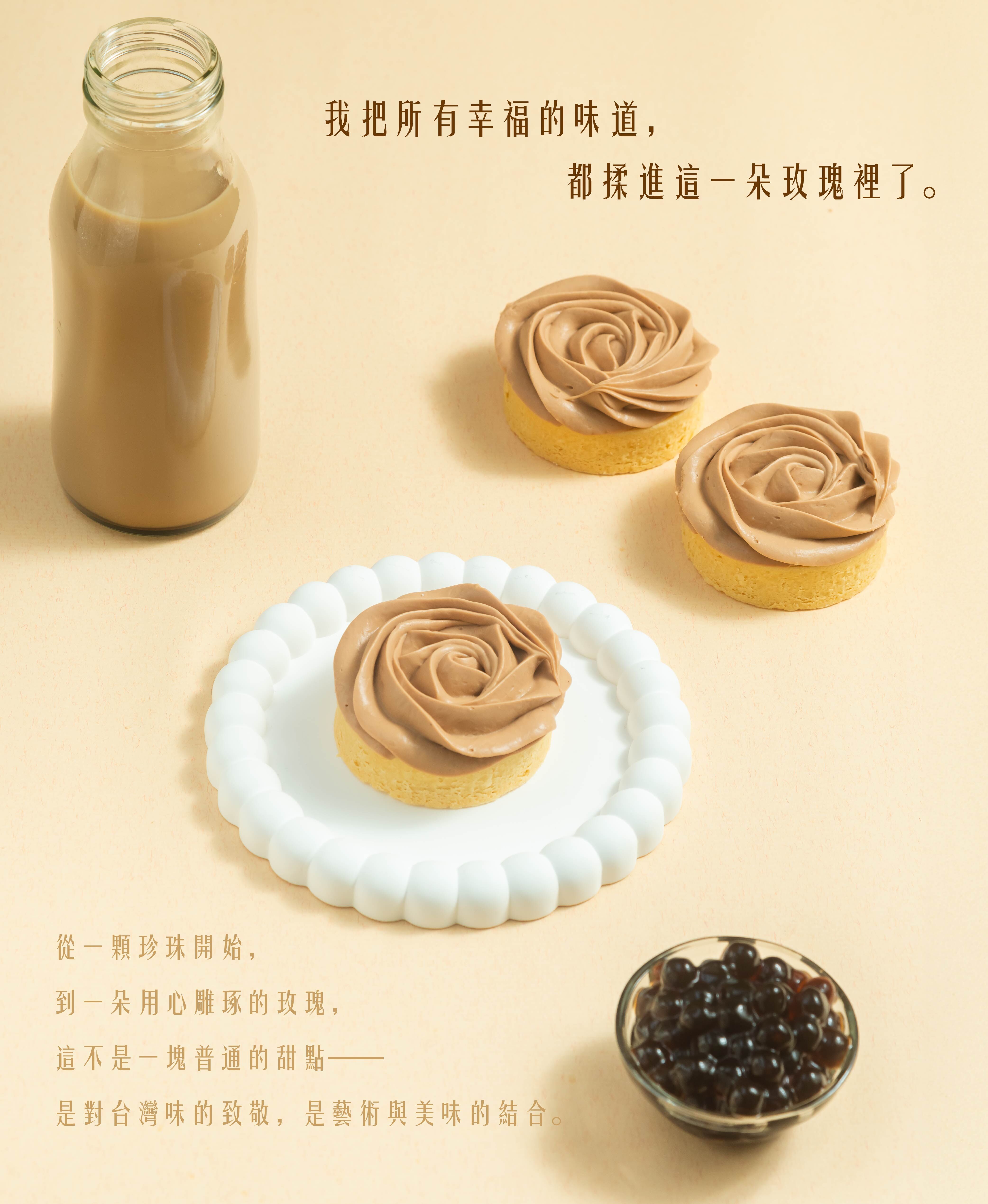 - 業界首創:將「台灣之光」珍珠奶茶,化作優雅玫瑰造型塔。