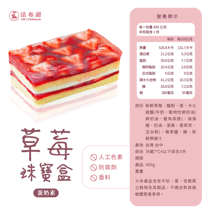 主要成分: 新鮮草莓、麵粉、蛋、卡士達醬(牛奶、動物性鮮奶油(鮮奶油、鹿角菜膠)、海藻糖、奶油、蛋黃、香草莢、玉米粉)、莓果醬、糖、新鮮檸檬汁。