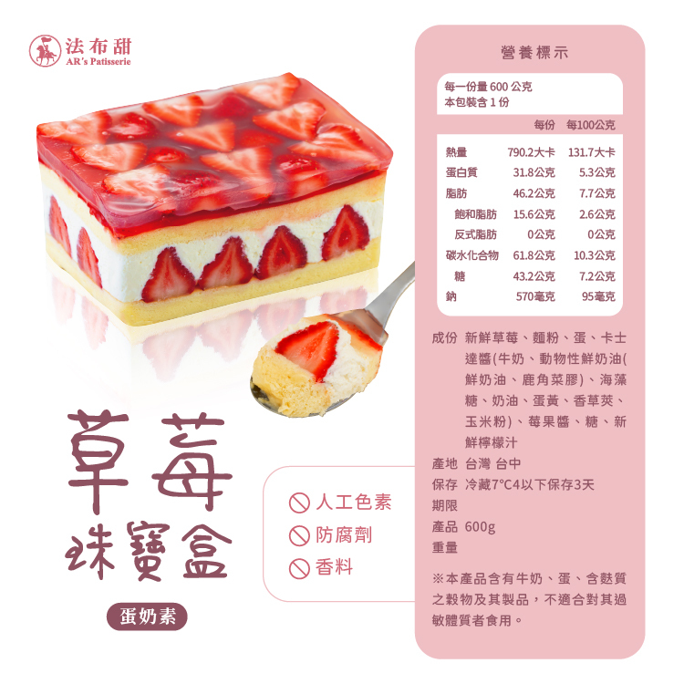 600g 大份量設計,法布甜「草莓珠寶盒」嚴選雙倍等級(視份量感調整)新鮮草莓,結合法國諾曼第發酵奶油與頂級乳酪起司。