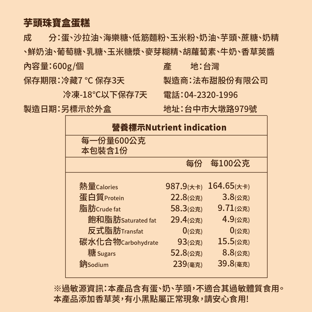 芋頭珠寶盒: 冷藏5°C,保存3天 / 冷凍-18°C,保存7天